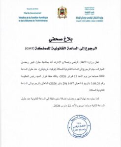 أعلنت وزارة الانتقال الرقمي وإصلاح الإدارة أن المغرب سيعود إلى الساعة القانونية للمملكة (توقيت غرينيتش GMT) بمناسبة حلول شهر رمضان المبارك، ابتداءً من الساعة الثالثة صباحًا يوم الأحد 15 فبراير 2026. وأوضحت الوزارة، في بلاغ لها، أن هذا الإجراء يأتي تنفيذًا لقرار رئيس الحكومة رقم 3.06.26 الصادر بتاريخ 9 شعبان 1447 هـ الموافق 29 يناير 2026، والمتعلق بالرجوع المؤقت إلى الساعة القانونية خلال شهر رمضان.