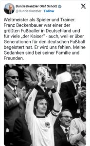 في غضون ذلك أشاد المستشار الألماني أولاف شولتس بـ “القيصر” بكنباور وقال عبر موقع إكس (تويتر سابقا) إن “فرانز بكنباور، بطل العالم كلاعب ومدرب، كان من أعظم لاعبي كرة القدم في ألمانيا، وكان هو القيصر بالنسبة للكثيرين لأنه ألهم أجيالا بالحماس تجاه كرة القدم الألمانية”. وأضاف: “سوف نفتقده، وأفكاري مع عائلته وأصدقائه”.